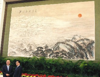 中新網(wǎng)5月29日電 中共中央總書記胡錦濤28日在北京人民大會(huì)堂會(huì)見(jiàn)中國(guó)國(guó)民黨主席吳伯雄一行。臺(tái)灣媒體注意到,雙方在“江山如此多嬌”巨幅畫前合影留念,蘊(yùn)含深意。