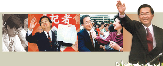 1986年,陳水扁擔任臺北市議員,因蓬萊島事件入獄,但也為他政治生涯加分;擔任“立委”期間,他一再揭發(fā)軍購弊案,被民間團體票選為第一名“立委”;1994年,他當選臺北市長,施政滿意度一度高達76%;2000年,他當選第一次政黨輪替的臺灣地區(qū)領導人;昨天,他卻成為第一位手銬加身的前領導人。