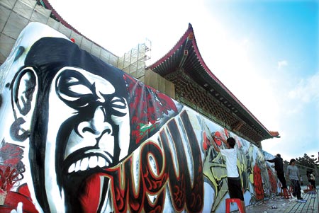 中新網(wǎng)10月22日電 據(jù)臺(tái)灣《中國時(shí)報(bào)》報(bào)道,昨日天氣晴朗,民眾紛紛外出走動(dòng),臺(tái)北“中正紀(jì)念堂”內(nèi)雖然有兩廳院屋宇修復(fù)工程,卻也舉行快樂涂鴉活動(dòng),邀請(qǐng)涂鴉高手在圍籬上一展身手,為修繕中的兩廳院增添了不同的面貌。