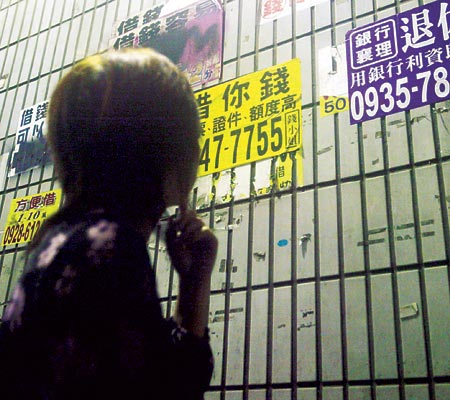 中新網(wǎng)11月1日電 據(jù)臺灣《中國時報》報道,臺當局“行政院”十月三十一日通過“融資公司法”草案,被外界視為“地下錢莊”將可順勢合法化,草案內(nèi)容規(guī)定自然人年利率上限為百分之二十,法人的上限為百分之三十。圖為市面街道的借貸放款小廣告。
