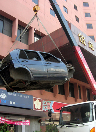 臺灣戲劇表演家“我是你爸爸”舞臺劇二十日在高雄市開演,劇團克服演出場地限制,將一輛報廢汽車吊掛至舞臺,在舞臺上呈現(xiàn)噱頭!爸醒肷纭眻D 程啟峰 攝