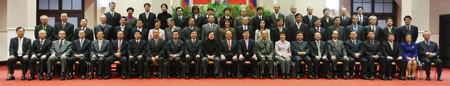 臺(tái)灣當(dāng)局“行政院”二十四日下午加開臨時(shí)“院會(huì)”,通過總辭案!靶姓洪L”張俊雄和全體成員拍“畢業(yè)照”留念。面對(duì)媒體關(guān)切和詢問,他不愿發(fā)表意見!爸醒肷纭眻D 蘇圣斌 攝