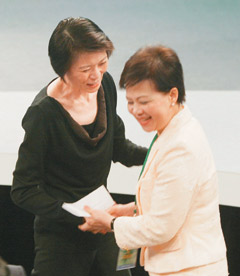 二00八年臺(tái)灣地區(qū)領(lǐng)導(dǎo)人選舉候選人第二場電視辯論會(huì)昨天舉行,馬、 謝辯論之前,馬英九夫人周美青(左),特地走向謝長廷夫人游芳枝(右)致意。臺(tái)灣《聯(lián)合報(bào)》圖 黃義書 攝