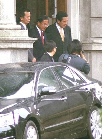 陳水扁與馬英九兩人選后的首度會面4月1日上午在臺北賓館舉行。會談結束后,陳水扁親自到門口送馬英九搭車離去,結束一場愚人節(jié)的扁馬會。(“中央社”圖 蘇圣斌 攝)