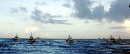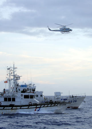 臺(tái)灣保釣人士以海釣船前往釣魚島宣示“主權(quán)”,十六日清晨當(dāng)保釣船只接近釣魚島海域時(shí),臺(tái)灣巡防艇(前)與日本保安廳巡邏艇(后)相互對(duì)峙,不讓日本船只接近保釣船,空中還有日本直升機(jī)沿途監(jiān)視。整個(gè)釣魚島海域布滿雙方海防艦艇,情形緊張中相互又頗節(jié)制!爸醒肷纭眻D