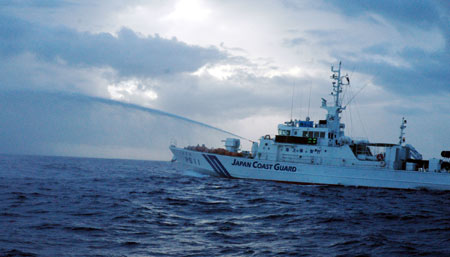 臺(tái)灣“全家!北a灤沾钶d著保釣人士前往釣魚島宣示“主權(quán)”,不過,日本保安廳巡邏艦出動(dòng)十多艘,還噴水、企圖碰撞、排黑煙、及蛇行引側(cè)浪企圖阻撓。保釣人士丟擲飲料瓶抗議!爸醒肷纭眻D