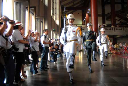 兩岸周末包機(jī)四日啟動(dòng),廣州首發(fā)旅游團(tuán)抵臺(tái)后即前往臺(tái)北“國(guó)父紀(jì)念館”參觀,正好看到三軍儀隊(duì)表演,感到很興奮,手中相機(jī)拍不停。