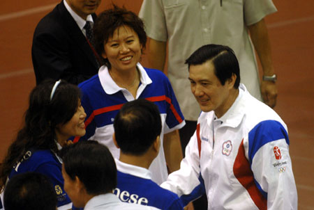 馬英九30日南下高雄左營選手訓(xùn)練中心,慰勉北京奧運(yùn)參賽受訓(xùn)選手、教練,預(yù)祝行程順利、奪標(biāo)成功。據(jù)悉,臺灣將派出80余名選手參加北京奧運(yùn)的15項(xiàng)運(yùn)動,第一批選手預(yù)定8月3日出發(fā)!爸醒肷纭眻D