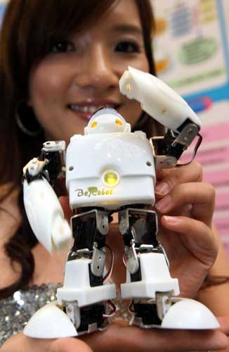 臺(tái)北國(guó)際機(jī)器人展八月二十一日在臺(tái)北世貿(mào)展覽館開幕,其中,榮獲吉尼斯世界紀(jì)錄全世界最小的教育娛樂機(jī)器人,由臺(tái)灣自行開發(fā),可程序編輯創(chuàng)造更多使用價(jià)值。(“中央社”圖)