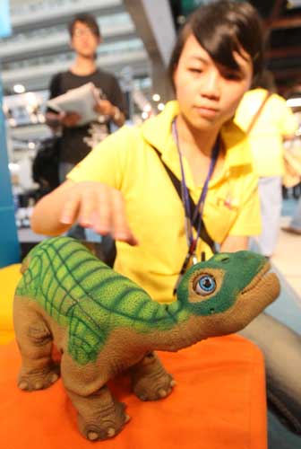 臺(tái)北國(guó)際機(jī)器人展八月二十一日在世貿(mào)展覽館開幕,展出的恐龍電子寵物Pleo是全球唯一具有生命型態(tài),會(huì)打呵欠、 嘆氣、打呼、打噴嚏,有400種以上動(dòng)作的貼心寵物。(“中央社”圖)