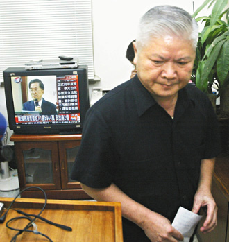 陳水扁昨天下午舉行記者會的同時,特偵組主任陳云南也舉行記者會,并同步收看電視,了解陳水扁的說法。(臺灣《聯(lián)合報》圖)
