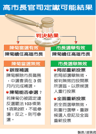 據(jù)臺灣媒體報道,一旦法院二審判定選舉無效或當選無效,依“選罷法”必須在三個月內(nèi)完成重新選舉。如果二審判定是“選舉無效”,根據(jù)“選罷法”第一○二條,其違法屬選舉之局部者,就該局部無效部分定期“重行投票”,否則就是全面“重新選舉”;如果法院的二審判定是“當選無效”,則要進行“補選”。若是選舉無效,陳菊可以再次參選,如果是當選無效,陳菊就不能再補選了。