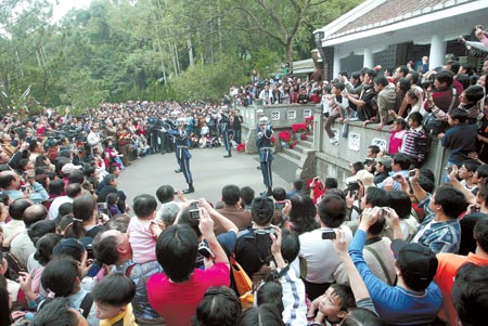 據(jù)臺灣《聯(lián)合報(bào)》報(bào)道,臺軍方宣布兩蔣陵寢今天起暫停對外開放,儀隊(duì)已于二十三日撤哨,駐守慈湖三十二年的“憲兵”也于晚間撤離。一早即吸引各地民眾涌入慈湖、頭寮兩處陵寢,有人表達(dá)懷念,有的來看熱鬧,慈湖每整點(diǎn)的儀隊(duì)交接更是擠爆陵寢區(qū),警方估算當(dāng)天共有七萬多人涌進(jìn)大溪。