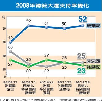 在支持度方面,擁護馬蕭的民眾由十月下旬的五成上升到五成二;力挺謝蘇的人則由兩個月前的二成五降至二成三;至于未決定的比率,仍維持在二成五。