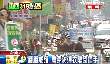 下午四點(diǎn)左右,陳水扁站在宣傳車上從臺(tái)南南定橋出發(fā)。與上次不同的是,宣傳車加高防護(hù),蓋住了他的招牌鮪魚肚。車隊(duì)在臺(tái)南市大街小巷穿梭,接近五點(diǎn)便來到當(dāng)年槍響的金華路,并做短暫停留。