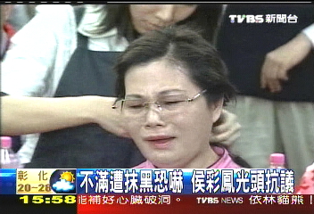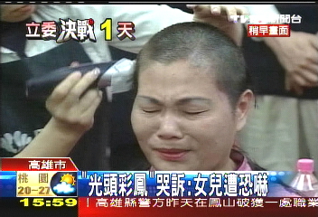 據(jù)臺灣TVBS報道,侯彩鳳一邊剃頭一邊眼眶泛淚,由于不滿對手放風聲,指她和家人、朋友涉嫌買票,讓她選情大受影響,更表示因為接到恐嚇信件,現(xiàn)在兒女都不敢回家,侯彩鳳也感到相當難過,因此今天以剃光頭表示無言抗議。