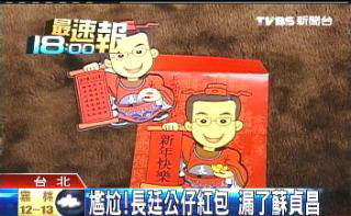 這還真是超尷尬,獨漏人氣也很高的蘇貞昌,不少電火球支持者強烈反應(yīng),蘇系子弟兵趕緊透過臺北縣競選總部,搶在年關(guān)前印出這一批剛出爐的長昌公仔紅包。比原版多了昌仔,設(shè)計上尊重謝長廷,昌仔硬是比長仔小了一截。