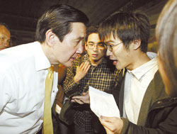不過,當(dāng)座談進入嚴(yán)肅的教育、社會福利、兩岸問題,馬英九馬上變身成“馬教授”身分,一板一眼。馬英九并期許大學(xué)生“更用功一點”,“希望各位為了自己、為了臺灣能更用功。”“格局更大一點!