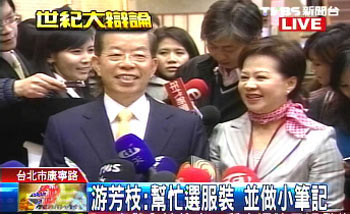 據(jù)“中央社”報(bào)道,民進(jìn)黨候選人謝長廷穿上游芳枝挑的深藍(lán)色西裝、黃色領(lǐng)帶,看起來相當(dāng)有精神。游芳枝也幫謝長廷貼心記了許多小筆記,寫在小卡片上。