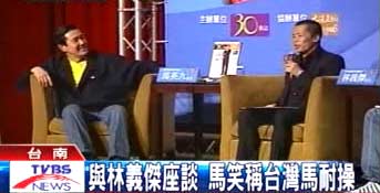 這邊造勢炮火很猛,另一頭則是溫馨的感性座談,馬英九和極限長跑好手林義杰面對面大講冷笑話。極限長跑好手林義杰:“在沙漠的時候,蒙古人騎的馬,他們的馬已經(jīng)跑不動了,就是因為路途太長,動物可能沒辦法接受!瘪R英九:“臺灣的馬不會這樣!