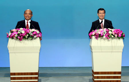 中新網(wǎng)3月10日電 臺(tái)灣地區(qū)領(lǐng)導(dǎo)人選舉唯一一場副領(lǐng)導(dǎo)人候選人電視政見發(fā)表會(huì)今晚登場,國民黨副領(lǐng)導(dǎo)人候選人蕭萬長與民進(jìn)黨副領(lǐng)導(dǎo)人候選人蘇貞昌透過兩輪交叉方式發(fā)表政見,他們互相批評(píng)對(duì)方領(lǐng)導(dǎo)人候選人的經(jīng)濟(jì)與兩岸政見,要選民選擇真正愛臺(tái)灣、守護(hù)臺(tái)灣的領(lǐng)導(dǎo)人。