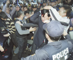 雖然謝營早安排青年軍手臂勾著手臂排成人墻維持秩序,但群情激憤的綠營支持者及部分干部還是“突破防線”,過程中,藍(lán)營“立委”遭到推擠,并被追打了幾下,警車前方擋風(fēng)玻璃遭砸毀,警車車頂被踏扁,警察也被突來的無名拳打中胸部,由于民進(jìn)黨臺(tái)北市議員擋在警車前方,前后方又有四輛宣傳車堵住警車的去路,警車?yán)г谌巳褐,?dòng)彈不得。