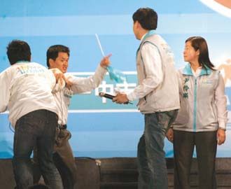 謝長廷18日在云林舉辦造勢晚會,執(zhí)行總干事李應(yīng)元介紹前“臺聯(lián)黨”“立委”尹伶瑛(右)加入民進(jìn)黨時(shí),一名民進(jìn)黨支持者(左二)沖上臺辱罵尹伶瑛。(圖:臺灣《聯(lián)合報(bào)》)