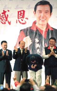據(jù)臺灣《聯(lián)合報》報道,馬英九26日到臺中縣市、苗栗、桃園等地謝票,民眾搶著和他握手,捉住機(jī)會就和“馬總統(tǒng)”合照。馬蕭在北、中臺灣大贏對手,馬英九夸支持者“很厲害”、“贏得太過分了!”向民眾鞠躬十秒鐘。