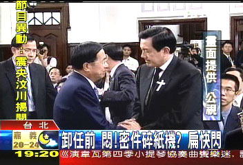 中新網(wǎng)5月15日電 5月20日臺灣當(dāng)局將進(jìn)行權(quán)力交接。即將卸任的陳水扁和就要接棒的馬英九,14日在柏楊追思會上相遇。陳水扁與馬英九碰頭后,兩人除了進(jìn)出場兩度握手后,沒有其它互動。