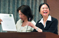 蔡煌瑯質(zhì)詢時(shí)間已超過很久,又冷不防說了一句,“你有沒有發(fā)現(xiàn)主席(李嘉進(jìn))讓我繼續(xù)質(zhì)詢你?”頓時(shí)引來哄堂大笑,蔡補(bǔ)一句說,“你知道在國民黨的處境了哦!幸媛姐,回來吧,回來中心思想吧,那個(gè)位置很燙啦!很燙啦!”經(jīng)過一整天的炮火轟炸,“兩岸人民關(guān)系條例修正草案”順利通過初審,賴幸媛也明顯地松了口氣。
