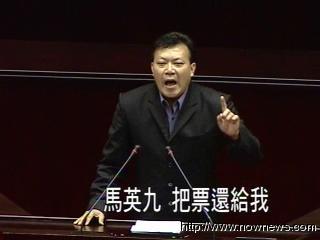 民進黨“立委”蘇震清嗆聲說,“馬英九把票還給我!”不過國民黨“立委”徐少萍馬上反擊:“我不知道蘇委員你是不是把票投給馬英九,不然你不能代表所有的臺灣同胞!