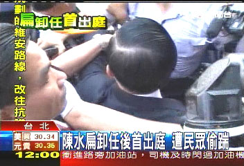 據(jù)“中央社”報(bào)道,陳水扁上午因出庭,在步入臺(tái)北地方法院時(shí),遭“愛(ài)國(guó)同心會(huì)”成員蘇安生突襲伸腿踹了一腳。蘇安生隨即被現(xiàn)場(chǎng)臺(tái)北市警方逮捕;訊后將依違反臺(tái)“社會(huì)秩序維護(hù)法”法辦。