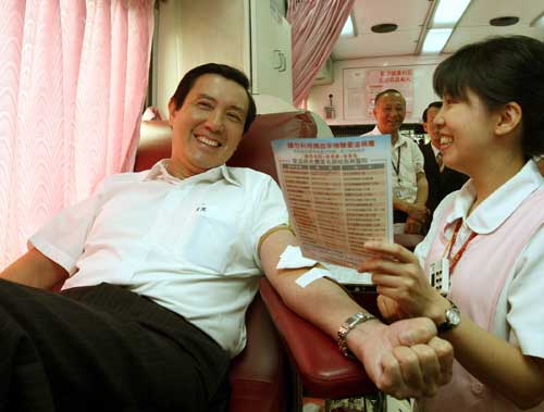 據(jù)“中央社”報(bào)道,馬英九23日參加捐血活動(dòng)并接見(jiàn)全臺(tái)40位績(jī)優(yōu)捐血人,其中40歲的崔德龍(分離術(shù))捐血達(dá)911次、60歲的鄭敬瀚(全血)捐血達(dá)241次。