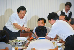 報(bào)道說,馬英九一坐下來,就拿起筷子準(zhǔn)備開動。馬英九替每位“閣員”夾菜,把白斬雞夾到“閣員”的盤子上時(shí),還不忘沾下醬油,相當(dāng)細(xì)心。
