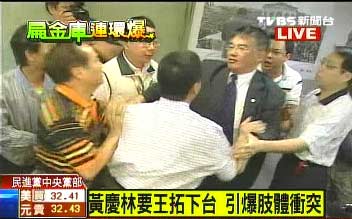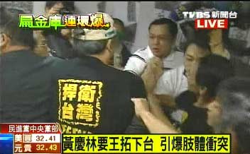 中新網(wǎng)10月13日電 民進(jìn)黨秘書長王拓指陳水扁違反民進(jìn)黨大是大非的一席話,不僅引起陳水扁反批,今日(13日)更在黨內(nèi)嚴(yán)重爆發(fā)分裂危機(jī)。民進(jìn)黨臺(tái)北市黨部主委黃慶林上午前往中央黨部找王拓理論,雙方人馬當(dāng)場就互相拉扯,爆發(fā)嚴(yán)重沖突。