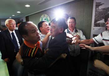 中新網(wǎng)10月13日電 民進(jìn)黨秘書長(zhǎng)王拓日前批評(píng)黨內(nèi)流行情義相挺的談話引發(fā)部分黨內(nèi)人士不滿。臺(tái)北市黨部主委黃慶林今天率眾到民進(jìn)黨中央抗議并要求王拓下臺(tái),中央黨部副秘書長(zhǎng)洪耀福接見時(shí)提及,“當(dāng)初第一個(gè)主張開除陳水扁的就是黃慶林”,此言立即引發(fā)沖突,黃慶林要求洪耀福道歉,但洪耀福拒絕。