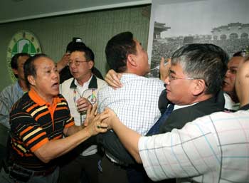 昨晚在臺(tái)北市舉辦挺扁大會(huì)的臺(tái)北市黨部主委黃慶林今天率眾到黨中央抗議,要求王拓下臺(tái)。中央黨部副秘書長(zhǎng)洪耀福接見時(shí)開口提及“當(dāng)初第一個(gè)主張開除陳水扁的就是黃慶林”時(shí),黃慶林立刻拍桌表示不滿,立即引發(fā)拉扯沖突,場(chǎng)面混亂,黃慶林人馬與中央黨部人員發(fā)生扭打,最后洪耀福在黨工的保護(hù)下先行離開。