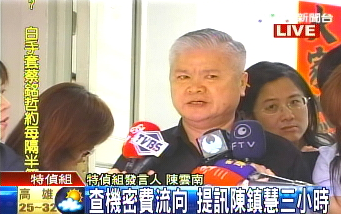 據(jù)臺(tái)灣TVBS報(bào)道,特偵組偵辦扁家海外密賬動(dòng)作頻頻,今天再借提兩位在押被告陳鎮(zhèn)慧、林德訓(xùn)到案。特偵組發(fā)言人陳云南表示,今天最主要是要厘清機(jī)要費(fèi)的細(xì)節(jié)部分,陳鎮(zhèn)慧所經(jīng)手的總金額,到底正確數(shù)字為何,檢察官已在進(jìn)一步厘清當(dāng)中。