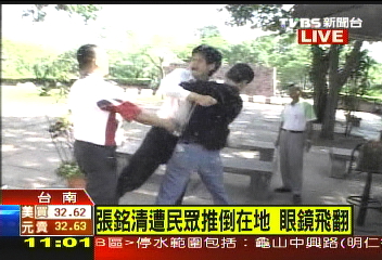 環(huán)球時報駐臺北特約撰稿人周先報道:據(jù)臺灣中天電視臺21日報道,抵臺進行學(xué)術(shù)交流的大陸海協(xié)會副會長張銘清21日上午在臺南市安平古堡參觀時,被綠營支持者推倒在地,當(dāng)張銘清準(zhǔn)備乘車離開時,有“臺獨”分子甚至跳上張的座車車頂狂踩,試圖阻止張銘清離開。另據(jù)臺灣TVBS電視臺消息,張銘清后腦勺被打,連眼鏡都被推飛了出去。