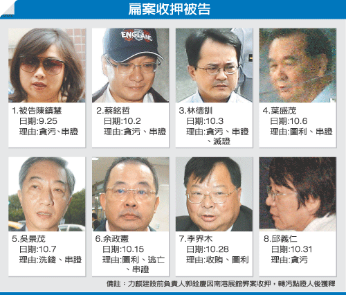 最早被收押的是卷入陳水扁家族洗錢疑案的力麒建設(shè)公司負責(zé)人郭銓慶,他在9月12日就因被臺北地檢署查出另涉世貿(mào)南港展覽館興建工程行賄標(biāo)案評選委員弊案,檢察官傳喚他到案,向臺北地方法院聲請羈押禁見獲準(zhǔn)。此后,除了機要費案和洗錢密賬案外,又開始不斷開花。案外案不斷,以致在一個多月內(nèi)連續(xù)收押陳水扁任內(nèi)出納陳鎮(zhèn)慧、“總統(tǒng)夫人助理”蔡銘哲、前陳水扁辦公室主任林德訓(xùn)、泄密的前“調(diào)查局長”葉盛茂、陳水扁妻子哥哥吳景茂、前“內(nèi)政部長”余政憲等人。