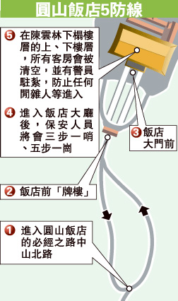 此外,臺警方31日也陸續(xù)在圓山飯店前的牌樓、忠烈祠、北安公園路口等放置拒馬,晚上6時許,保一總隊駐扎飯店門口,制服與便衣警員則定時入內(nèi)視察。警方表示,屆時將派40名霹靂小組干員,全天候貼身保護(hù)陳云林,每天至少有800名警員執(zhí)勤;若抗議者施放沖天炮,恐引發(fā)火警,一旦逮捕違規(guī)者,警方一律移送法辦,確保陳云林在臺期間的人身安全。