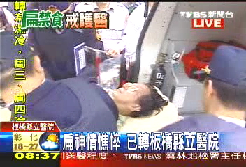 由于板橋醫(yī)院急診室沒有如亞東醫(yī)院一樣大的門戶,因此陳水扁在收押絕食后在媒體面前首度曝了光。閉目養(yǎng)神的陳水扁躺在擔架上,神情顯得相當憔悴,在醫(yī)護、維安人員護送下,進駐至板橋醫(yī)院7樓的戒護病房,由維安人員加派人手實施戒護。