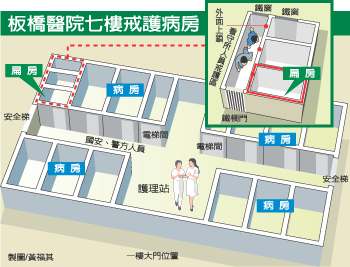 板橋醫(yī)院的戒護(hù)病房雖然沒(méi)有窗戶,但因是中央空調(diào),不至于有空氣無(wú)法流通問(wèn)題。雖然戒護(hù)病房里都備有手銬腳鐐等戒具,但并未使用。