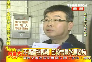 邱毅日前指陳水扁利用專(zhuān)機(jī),把巨額款項(xiàng)運(yùn)送到帕勞分行,陳水扁辦公室反駁是胡亂指控,邱毅4日南下高雄地檢署,控告陳水扁。圖片來(lái)源:臺(tái)灣TVBS