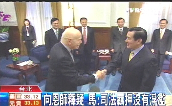 中新網(wǎng)12月16日電 馬英九在美求學(xué)時(shí)的老師孔杰榮質(zhì)疑臺(tái)相關(guān)部門(mén)對(duì)陳水扁案件司法羈押的正當(dāng)性;今天馬英九接見(jiàn)這位恩師時(shí)澄清,上手銬不是針對(duì)個(gè)人,臺(tái)灣司法羈押也沒(méi)有浮濫的情況。