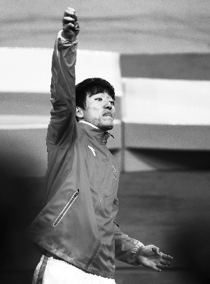 換鞋、脫衣服、換衣服———黑色T恤換成了白色T恤,上面印著劉翔的跨欄頭像。劉翔跨欄試跑后,兩手做出“六”的姿勢,感覺不錯的“飛人”喝了點礦泉水。隨后,劉翔扭扭脖子,活動活動筋骨,再脫掉訓(xùn)練服,換上比賽服。