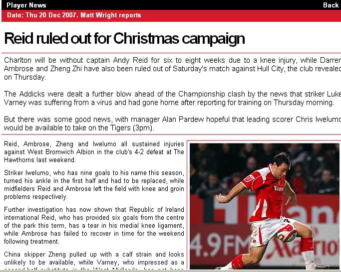 查爾頓目前雖然聯(lián)賽排名滑到第六,但是與榜首只有4分差距。對這支志在沖超的球隊來說,8名一線隊員因傷缺陣絕對是個壞消息。隊長里德膝蓋的傷勢不輕,至少需要休戰(zhàn)6-8周,查爾頓將面臨嚴(yán)峻的挑戰(zhàn)。