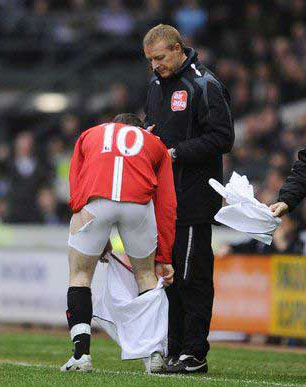 雖然沒有進(jìn)球,但曼聯(lián)10號極其勇猛,比賽中他在與對方的一次沖撞中,連球褲也被撕爛。魯尼被迫在邊線外上演一幕現(xiàn)場更換褲子的花絮。從現(xiàn)場畫面看,魯尼不僅球褲破了,連打底的內(nèi)褲也被撕爛,臀部還有明顯的傷痕。功夫不負(fù)有心人,賣力的魯尼終于創(chuàng)造了一次左路傳中,幫助小小羅射入了制勝一球。小小羅進(jìn)球后,魯尼不禁飛身撲到他的背上大吼……