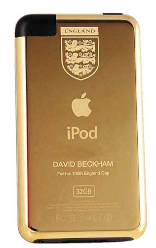這款個性化iPod Touch的內(nèi)存容量為32GB,機身鍍金,背部刻上了“大衛(wèi)·貝克漢姆,代表國家隊出場比賽100場”的字樣,非常酷炫。