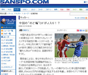 李瑋鋒即將加盟日本J聯(lián)賽的消息最早見諸于17日的日本雅虎體育。當(dāng)時(shí),雅虎體育就以“功夫足球?qū)⒌顷懭毡?”為題,曝出了中國(guó)國(guó)家隊(duì)主力李瑋鋒即有可能在明年初加盟J聯(lián)賽,并稱李瑋鋒“作為最強(qiáng)最兇悍的后衛(wèi),堪稱中國(guó)功夫足球的代名詞”。19日,日本產(chǎn)經(jīng)體育等多家媒體進(jìn)一步證實(shí)了這一消息,并稱“動(dòng)粗小子”李瑋鋒的到來(lái)不 啻為一場(chǎng)“恐怖襲擊”。